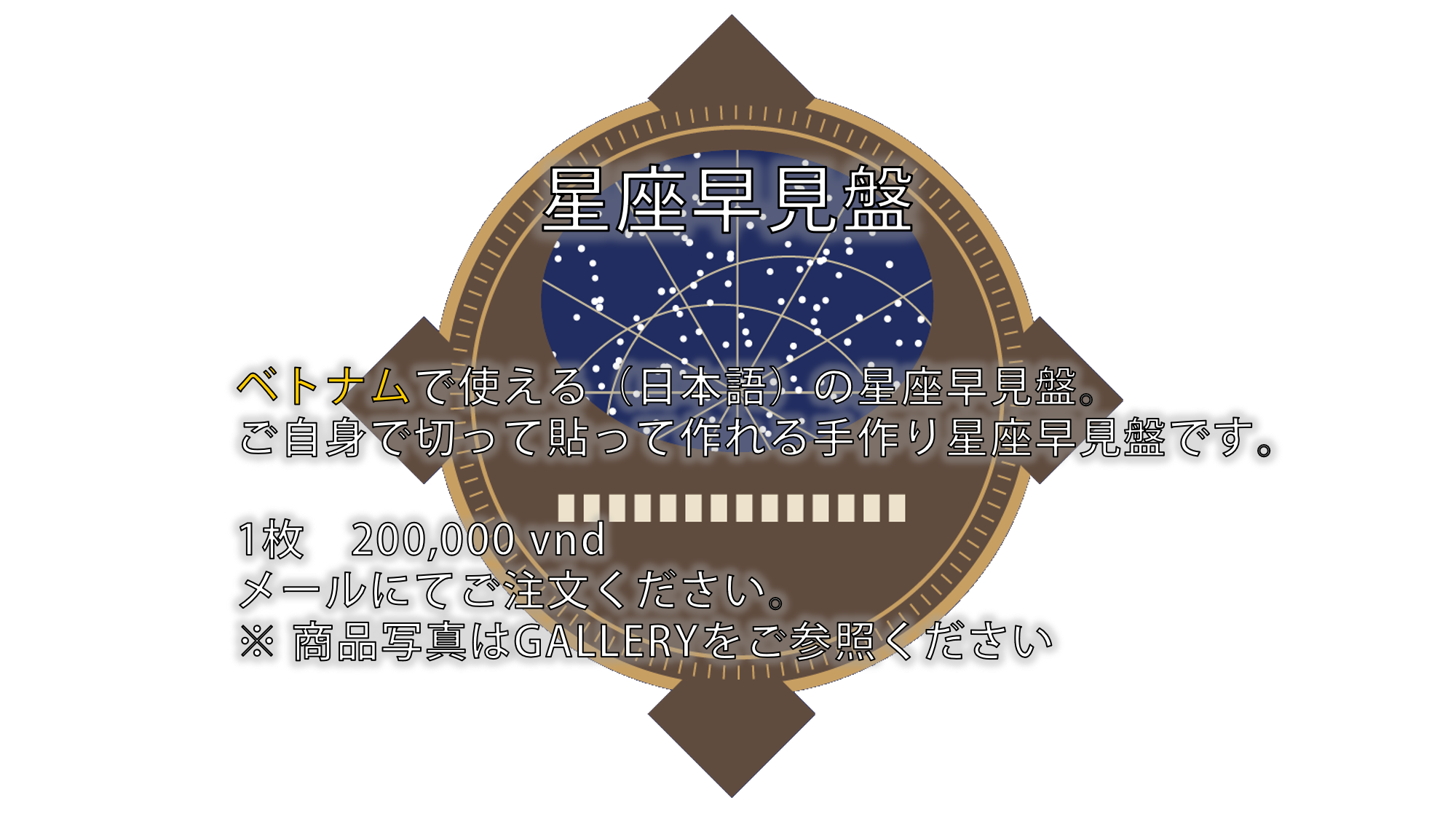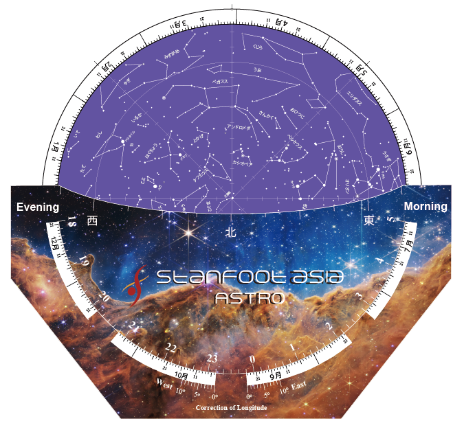 ベトナムで使える『星座早見盤』を作りました! 日本とベトナムは緯度が異なるため、見える星座が違います。 例えば、有名な「みなみじゅうじ」 ベトナムでは春の星座として、見ることができます。 そんな、みなみの星座たちが載った星座盤を ご家庭で楽しみながら作ってみませんか? おうちで、切って、貼って作れる工作キットです。 価格200,000 VND (without tax) ※納期1週間 以下の情報を添えて、fuyuko@stanfoot.asia または STANFOOT ASIA Co., Ltd Facebook page(https://www.facebook.com/StanfootAsia) にてご注文くださいませ。 お名前(ローマ字): お電話番号: ご住所: ご希望枚数: 詳細画像はGALLERYをご覧ください。