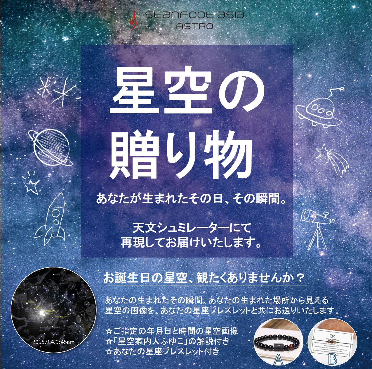 「星空の贈り物」始めました! 見上げるほしたちに、同じ夜空はふたつとありません。 星座を作る星たち、その中を彷徨う惑星、毎日、形と位置を変える月、 それらが組み合わさると、ふと見上げた夜空は一期一会なのです。 あなただけの特別な夜空。 ご希望の日時、場所をご指定頂くと、その夜空を月や惑星まで再現してお届けします。 どんな星空に見守られて産まれてきたのか『お誕生日プレゼント』に、 未来を一緒に見つめた夜空はどんなだったか『大切な記念日の思い出』に。 門出の涙を流したあの日、 笑いあい、絆を深めたあの時の、 あなたの特別な日の星空を、お手元にお届けします。 宙旅ナビゲーターⓇFuyukoの解説付き。 2種類から選べるブレスレットもお付けします。 価格500,000 VND (without tax) ※納期1週間〜2週間 以下の情報を添えて、fuyuko@stanfoot.asia または STANFOOT ASIA Co., Ltd Facebook page(https://www.facebook.com/StanfootAsia) にてご注文くださいませ。 申し込み者 お名前(ローマ字): お届け先 お名前(ローマ字): ご指定年月日: 年 月 日 時 分 場所:(世界中どこの場所でもOKです) ご希望ブレスレット種類(A or B):GALLERY参照 お申込み者のお電話番号: お届け先のご住所: 詳細はGALLERYをご覧ください。